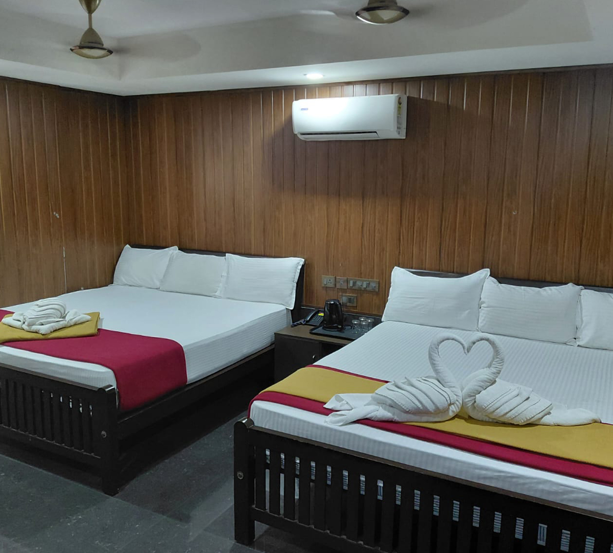 Experience spacious comfort and convenience with our Quadruple AC and Non-AC Rooms, designed especially for families and small groups visiting the renowned Chottanikkara Bhagavathy Temple. Located just a short distance from the temple, our hotel offers the perfect blend of traditional hospitality, modern amenities, and easy accessibility for pilgrims and travelers alike. Whether you are visiting for spiritual purposes, a family function, or a leisure trip, our Quadruple Rooms provide ample space and comfort for up to four guests — ensuring a pleasant and memorable stay for everyone.